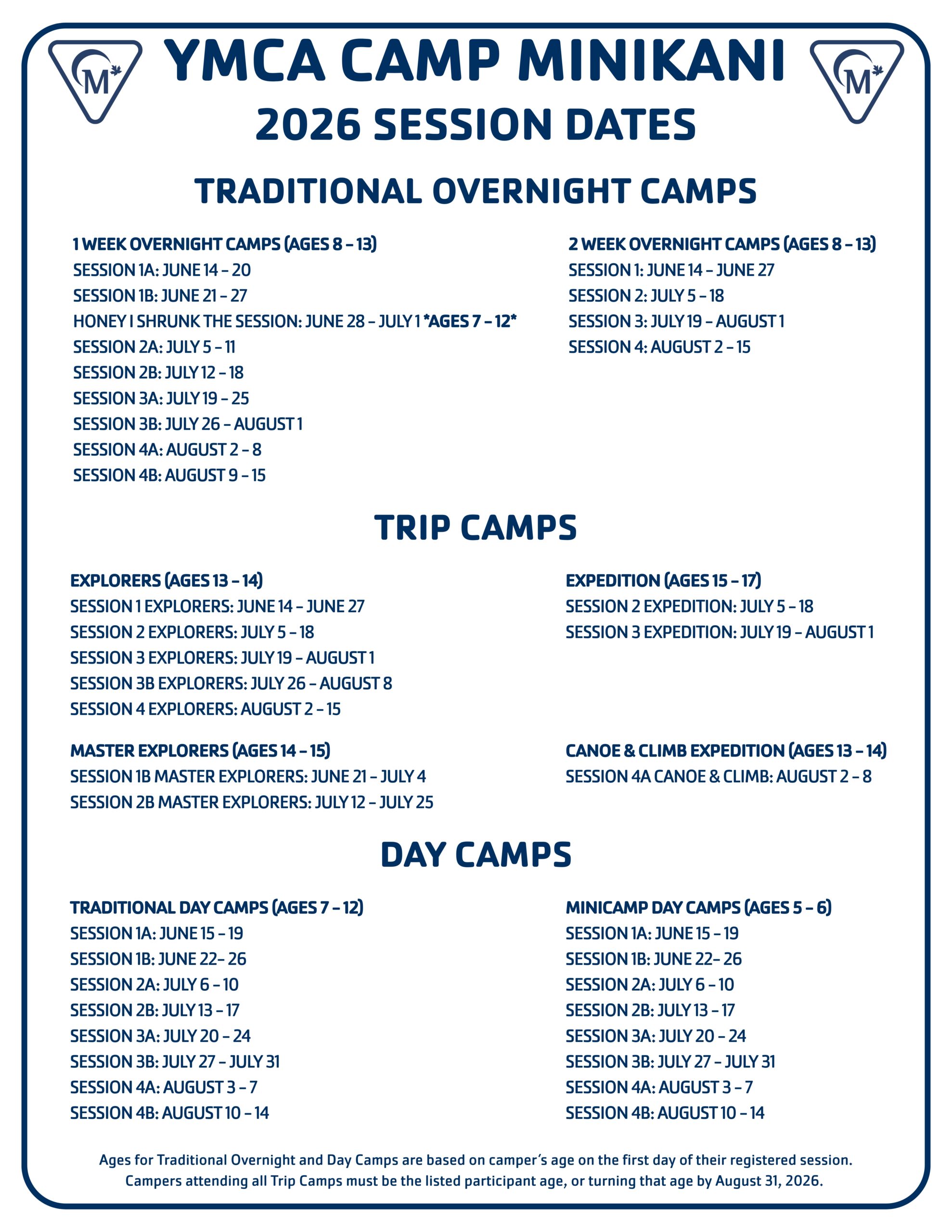 • Financial Aid: The YMCA’s Financial Assistance Program, supported in part through the contributions to the YMCA Camp Minikani Annual Campaign, provides aide for those in need, within our available resources, helping families who otherwise may not be able to attend camp. For more information contact camp at 262-251-9080.